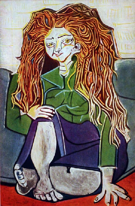 Pormelin had expressly shown her distain for America's involvement in Korea in one of her novels. She also wrote two articles in praise of Picasso's War and Peace opinions and several books recounting the time she spent with Picasso. This portrait shows Pormelin seated on the floor, as, engrossed in one of the intense political conversations that often took place between Picasso and the writer. Her wild red hair cascades over her shoulders uncontrollably, which, together with her engaged but ungainly posture, suggest a spirited and passionate individual.